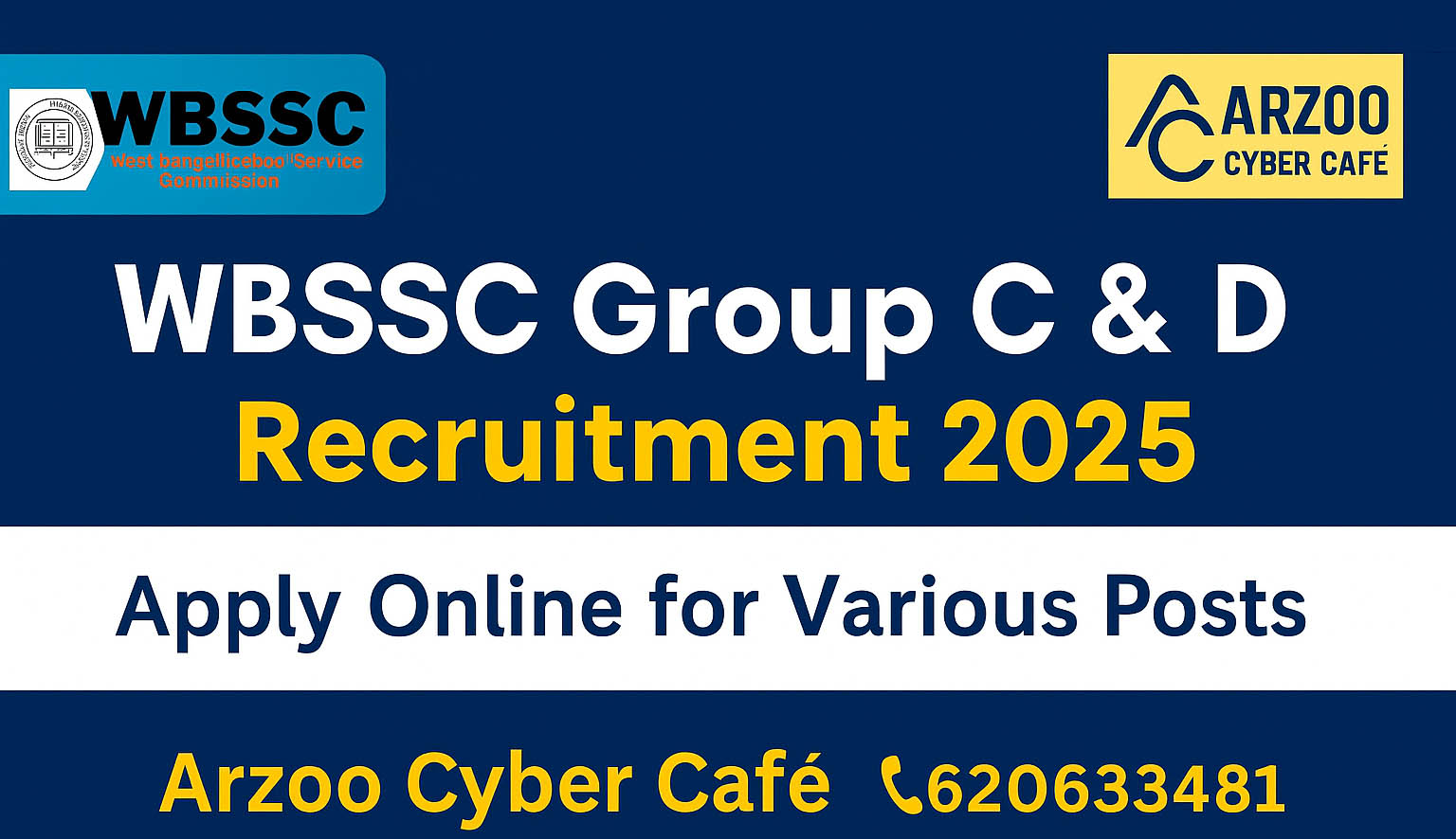 Post Date: 03 November 2025 | Short Information: West Bengal School Service Commission (WBSSC) ने Group C (Clerk) और Group D (Peon, Lab Attendant) के लिए 8477 पदों पर भर्ती निकाली है। इच्छुक उम्मीदवार नीचे दिए गए विवरण को ध्यान से पढ़ें और फिर आवेदन करें। Arzoo Cyber Café से घर बैठे Online Apply करवाया जा सकता है।
